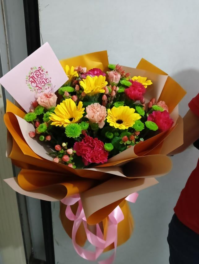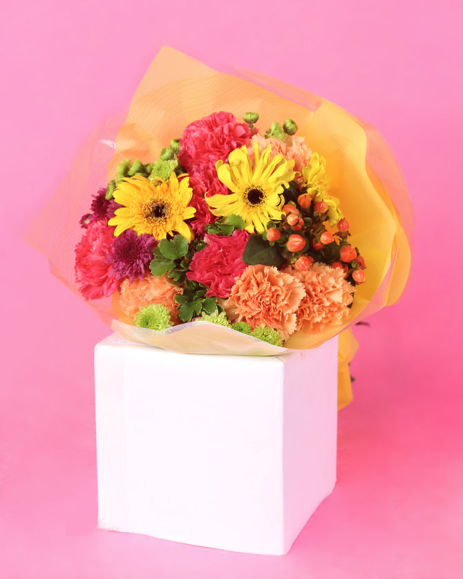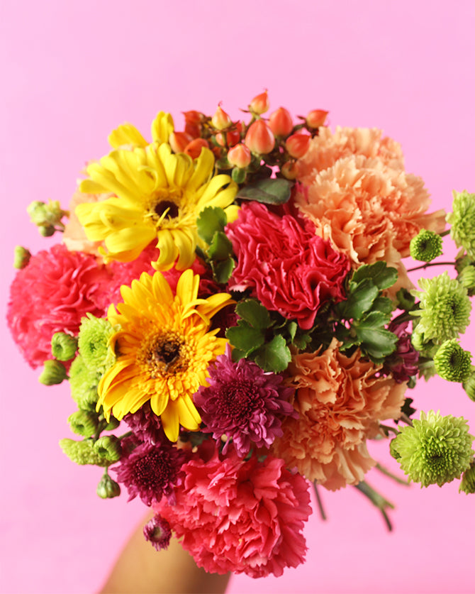 A bouquet of carnations, gerbera, and chrysanthemums.