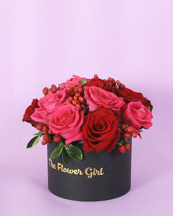 Elevate your big romantic gesture with Juliet- an elegant boxed arrangement with the biggest garden-fresh red and fuchsia Ecuadorian roses.