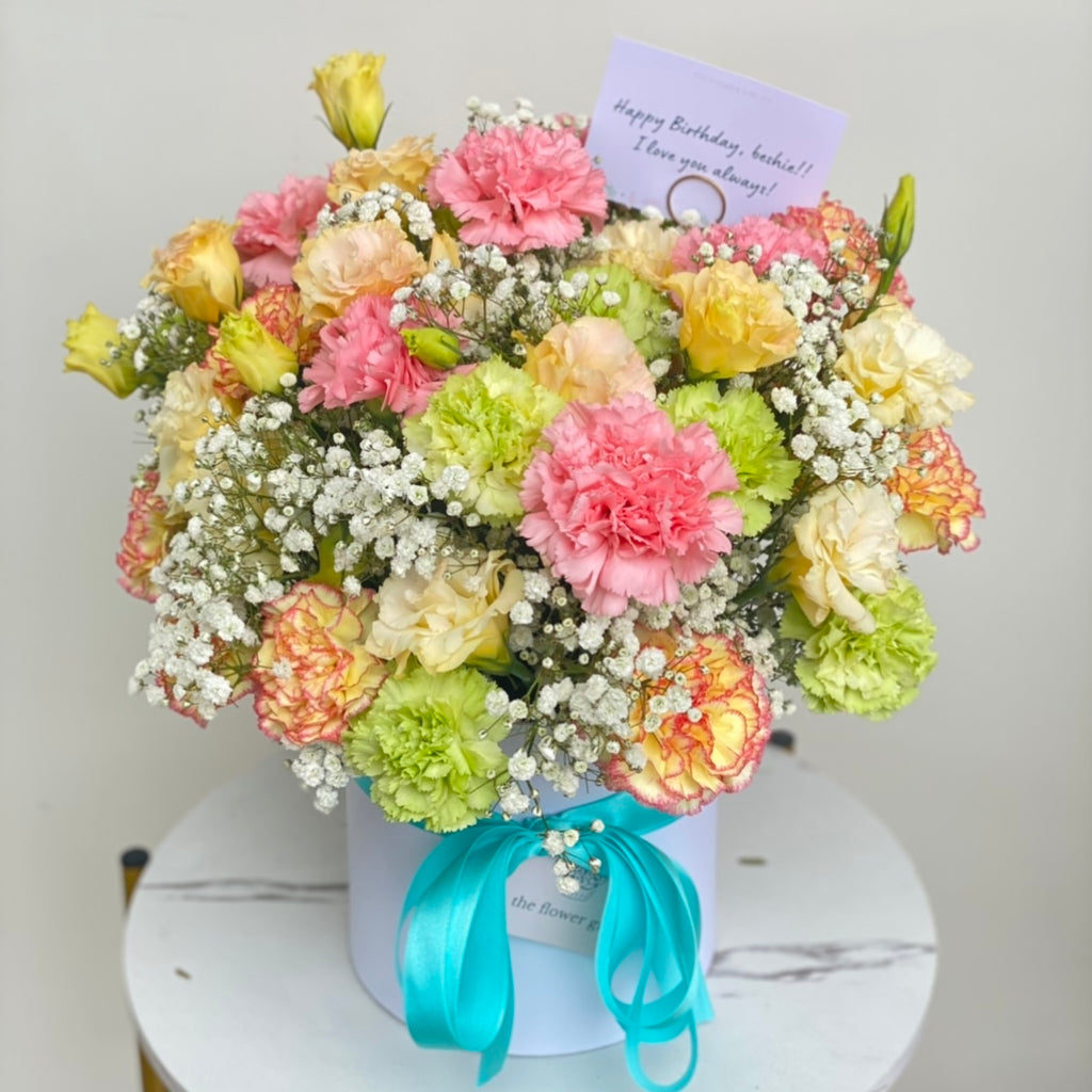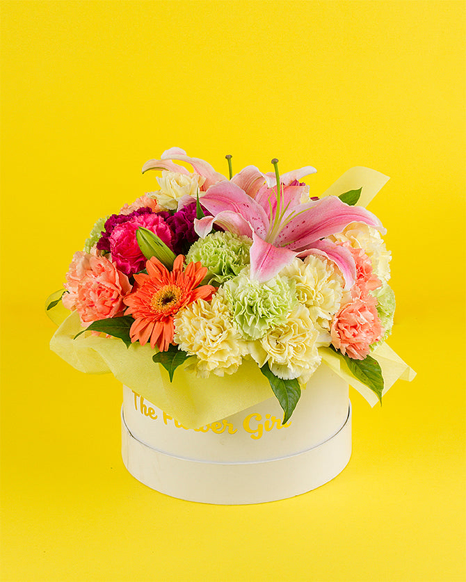 A boxed flower arrangement with an assortment of fresh springtime blooms which include lilies, carantions,  and gerberas.